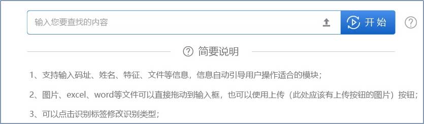 建設統一入口界面,實現用戶的多種輸入方式,包括但不限于各類碼址、名稱、地址、特征片段、數據文件、文檔文件等。支持通配符方式;支持中英文兩個語種的輸入支持和判斷,支持中英文混合輸入;支持多條信息或文件的輸入。